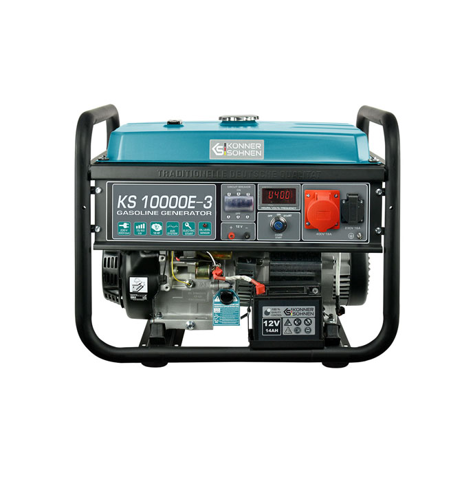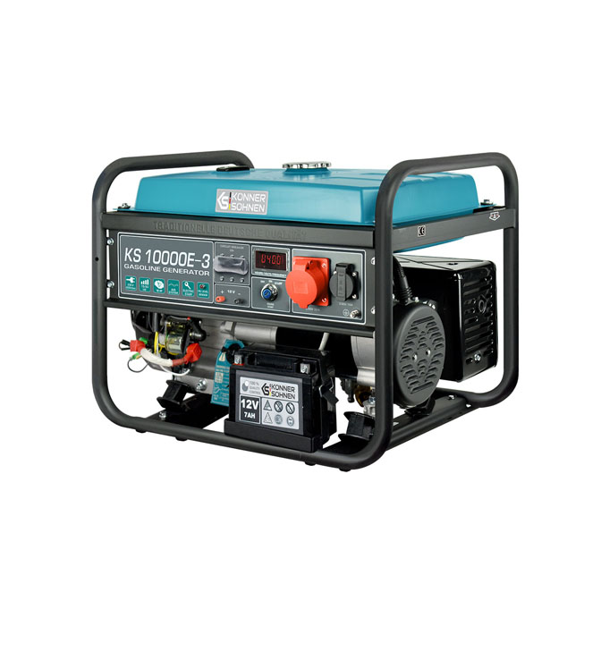 Könner & Söhnen KS 10000E-3 on töökindel kolmefaasiline (400 V) bensiinigeneraator, mis pakub suurt võimsust ja stabiilset elektritoidet nii professionaalseks kasutuseks kui ka koduseks varutoiteks. EURO V standardile vastav mootor tagab väiksemad heitmed ja parema efektiivsuse, samal ajal kui tugev terasraam ja vaskmähis annavad seadmele pika kasutusea.