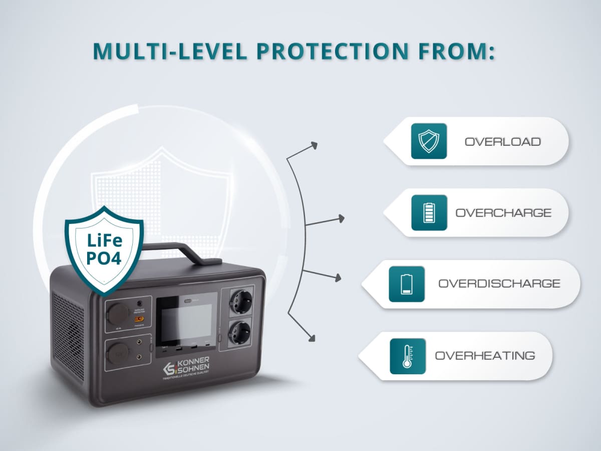 Ohutuse eest hoolitseb mitmetasemeline kaitsesüsteem, mis hoiab ära ülekoormuse, ülelaadimise, ülepinge ja ülekuumenemise.