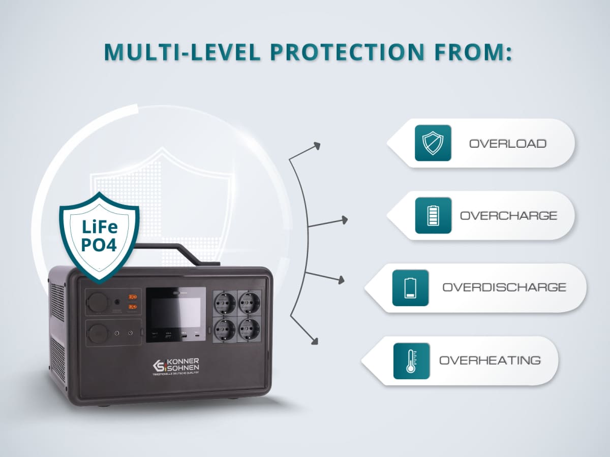 LifePO₄ aku tagab pika eluea, ohutuse ja stabiilsuse. Jõujaam töötab automaatse katkestusteta toiteallikana (UPS), mis lülitub elektrikatkestuse korral koheselt üle akutoitele, tagades seadmete järjepideva töö.