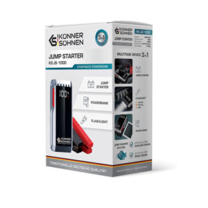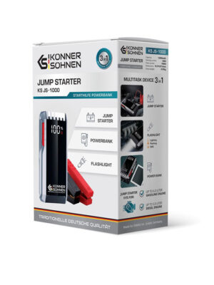 Könner & Söhnen® KS JS-1000 on kompaktne ja töökindel käivitusabi, mis pakub kiiret lahendust tühjenenud autoaku käivitamiseks, eriti külmal ajal. Seadmel on 12 000 mAh liitiumioonaku ja 1000 A tippvool, mis sobib bensiinimootoritele kuni 6 L ja diiselmootoritele kuni 3 L.