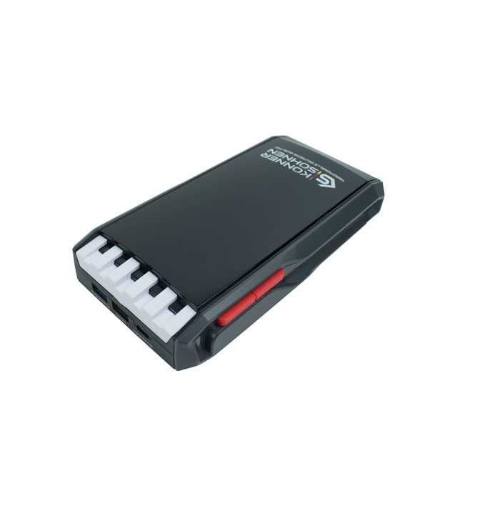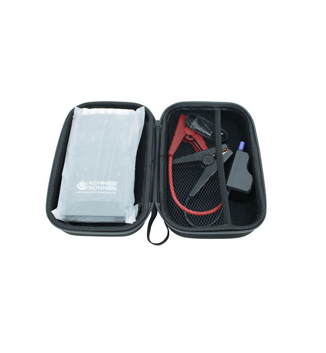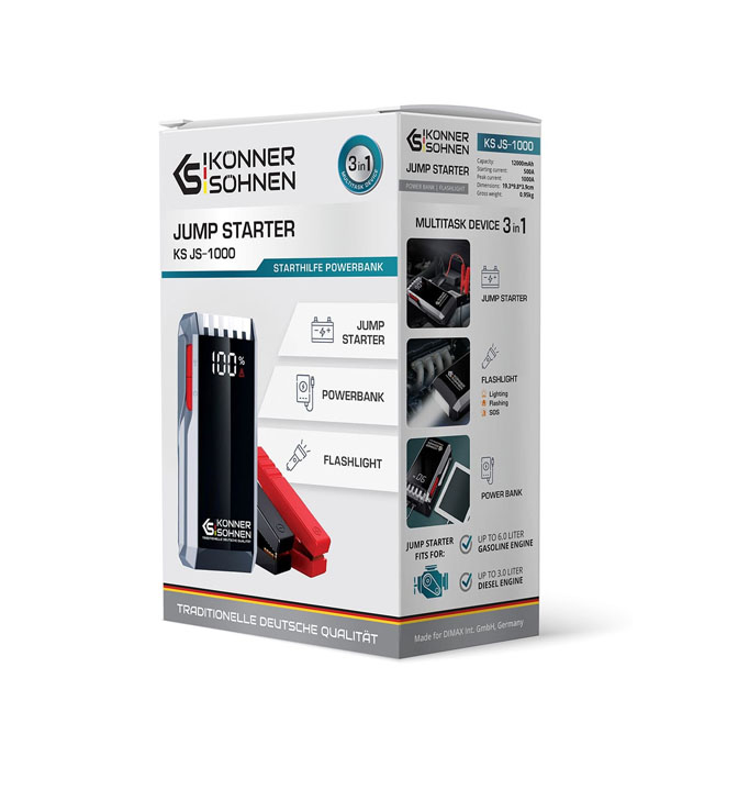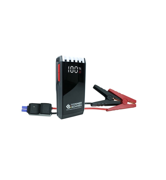 Käivitusabi 1000A, 12Ah, KS JS-1000, Könner & Söhnen on kaasas uuendatud klemmid, mis tagavad parema vooluülekande ja stabiilse ühenduse. Lisaks toimib KS JS-1000 varupangana (powerbank), millel on kaks USB väljundit – 5V/3A ja 5V/2A – nutiseadmete, kaamerate ja muude väiksemate seadmete laadimiseks.