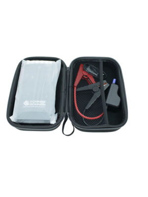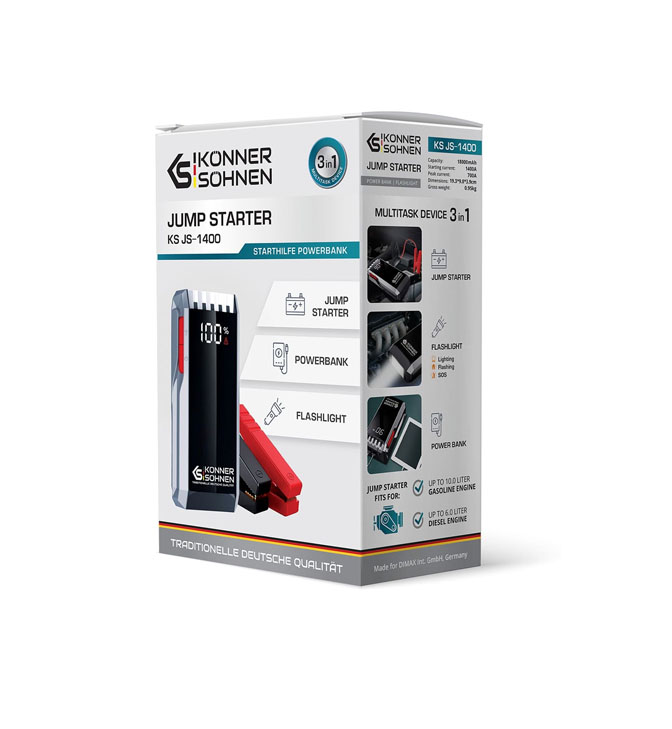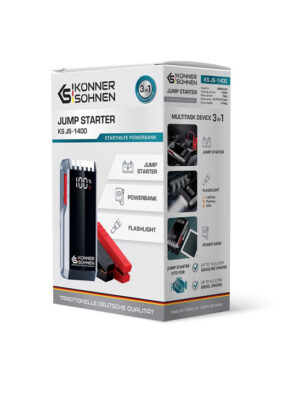 Könner & Söhnen® KS JS-1400 on kompaktne ja võimas käivitusabi, mis võimaldab kiiresti käivitada tühjenenud autoaku – eriti talvistes tingimustes, kui akujõud langeb oluliselt. Seadme 18 000 mAh liitiumioonaku ja 1400 A tippvool võimaldavad käivitada bensiinimootoreid kuni 10 L ja diiselmootoreid kuni 6 L mõne sekundiga.