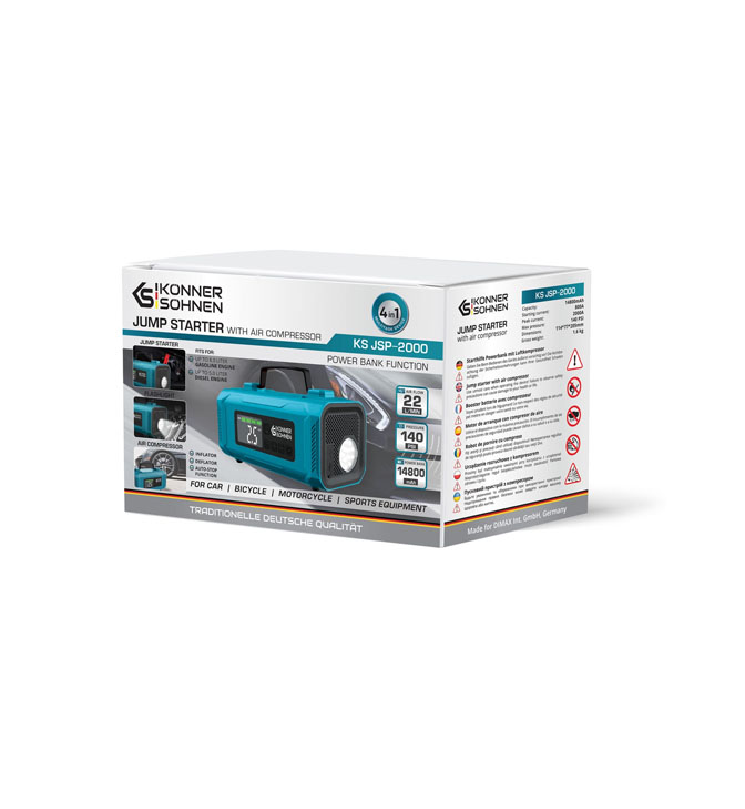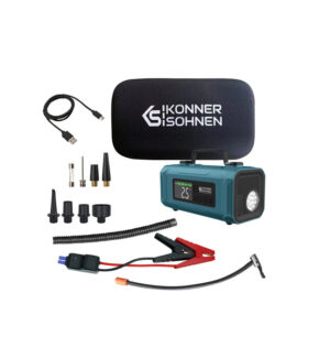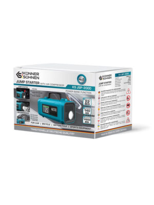 Könner & Söhnen 12V käivitusabi ja kompressor KS JSP-2000 on võimas ja usaldusväärne 4-in-1 seade, mis on loodud autojuhtidele, kes soovivad alati olla valmis ootamatuteks olukordadeks.