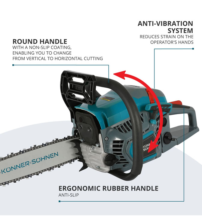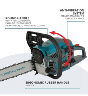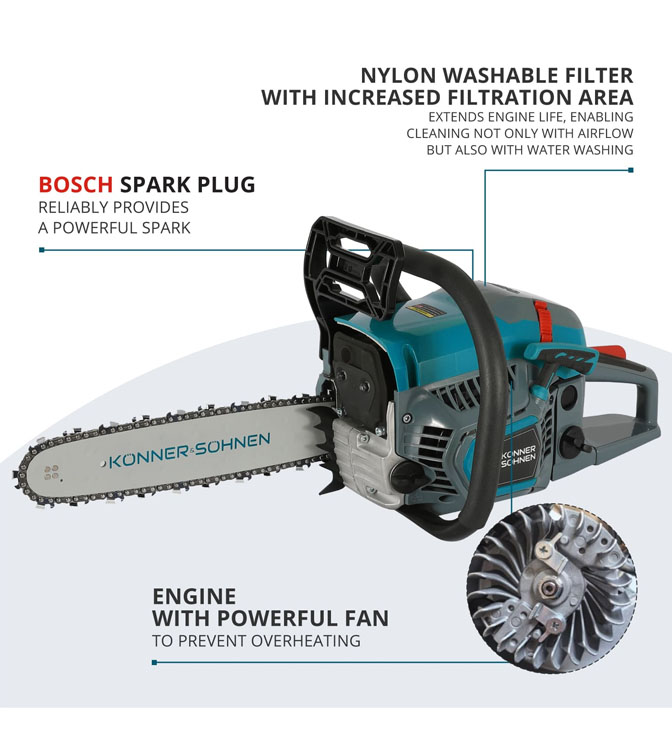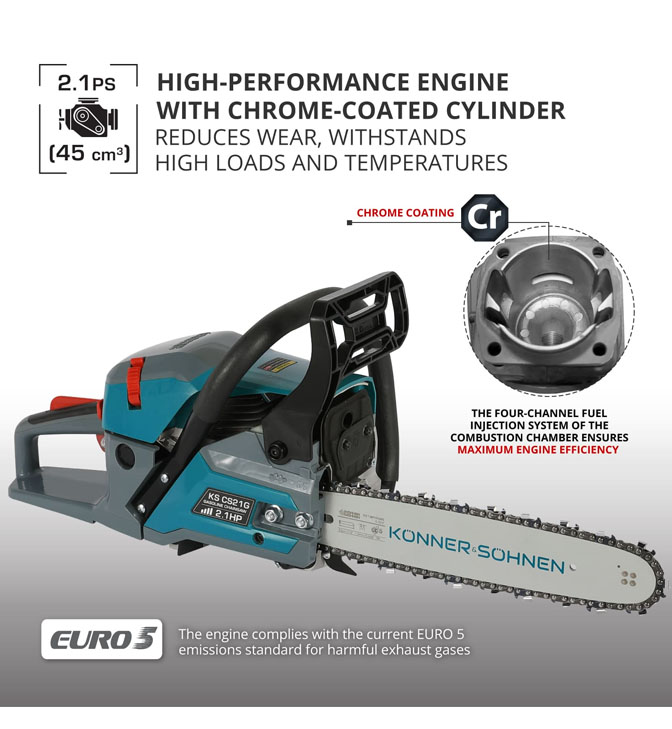 Könner & Söhnen® bensiinimootoriga kettsaag KS CS21G-13 on kompaktne ja töökindel tööriist, mis sobib suurepäraselt koduseks puude lõikamiseks, okste eemaldamiseks, aedade rajamiseks ja üldiseks haljastustööks.