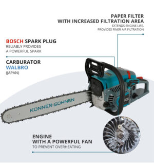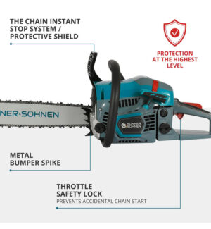 Turvalisus on Könner & Söhnen saagide puhul prioriteet. Seetõttu on mudelil inerts-reaktsiooniga ketipidur, mis peatab keti koheselt ootamatutes olukordades, ning ketipüüdja, mis takistab tagasilööke keti purunemisel. Gaasiluku mehhanism hoiab ära juhusliku käivituse.