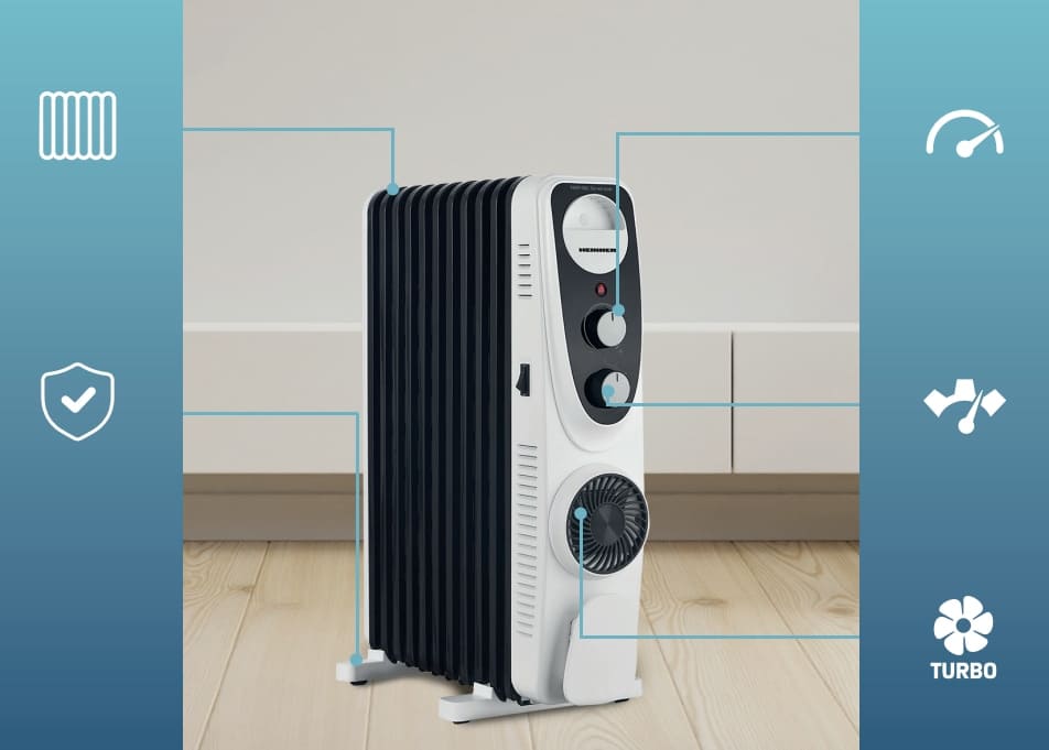 Õliradiaator Heinner HOH-MVT11WH-BK – 11 elementi, 2300W + turboventilaator