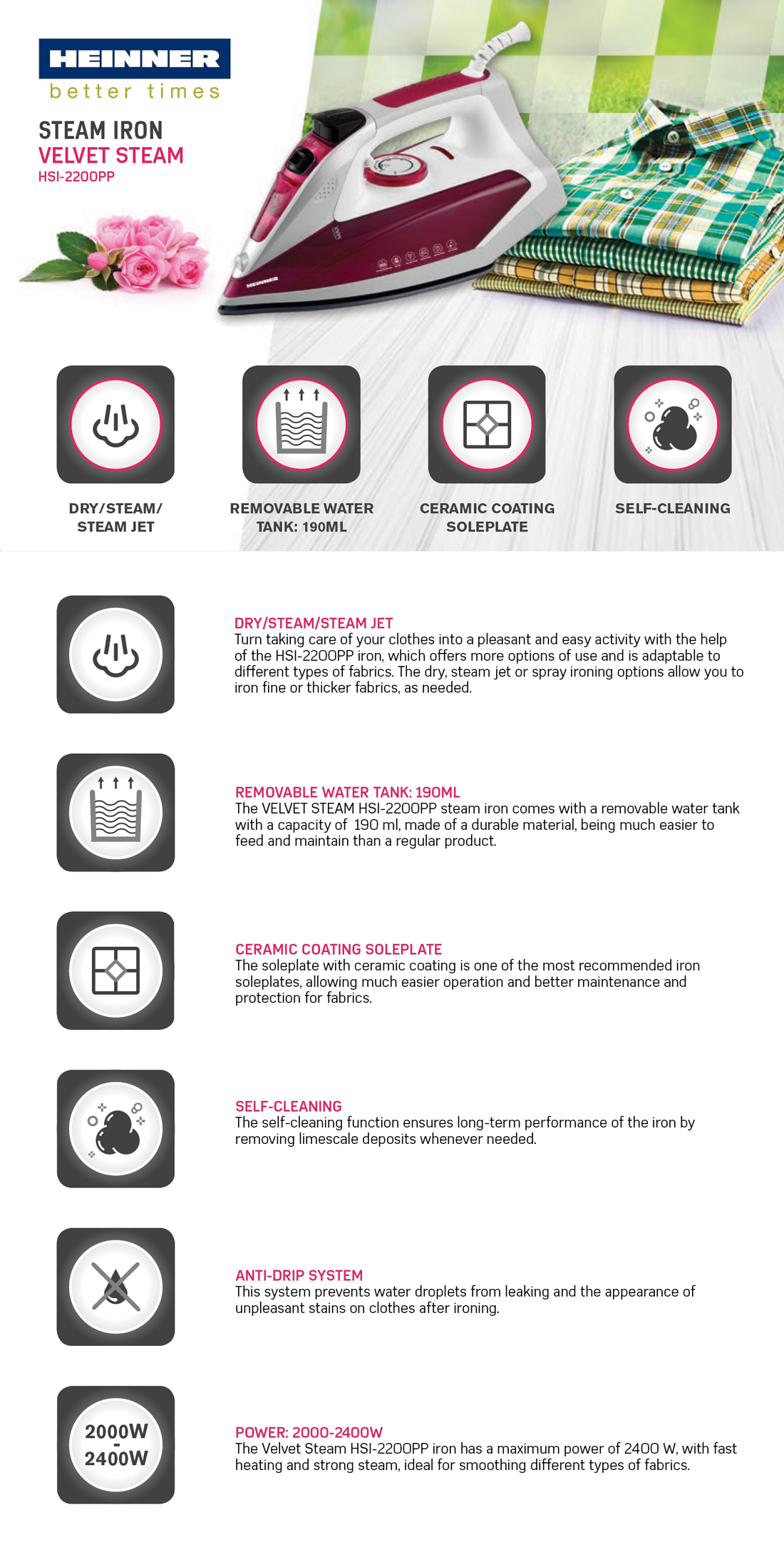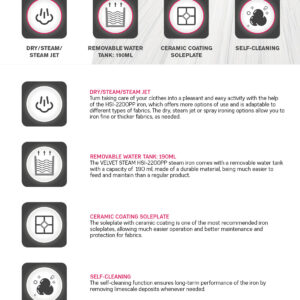 Aurutriikraud Heinner VelvetSteam HSI-2200PP pakub mugavat ja tõhusat triikimiskogemust nii igapäevaste kui ka nõudlikumate triikimistööde jaoks. Võimas 2000–2400 W küttekeha tagab kiire kuumenemise, keraamiline tallaplaat libiseb sujuvalt üle erinevate kangaste ning eemaldatav veepaak muudab täitmise eriti lihtsaks.