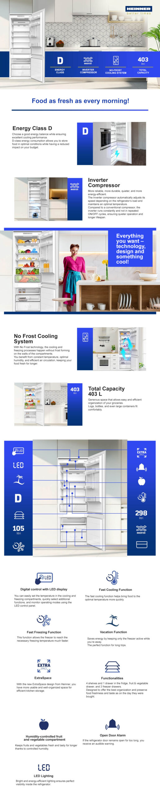 Integreeritud LED-valgustus tagab mugava nähtavuse ja A++ energiatõhususega kompressor (Heinneri uutel mudelitel tähistatud kui Energiaklass E, vastavalt uuele EL skaalale) hoiab kulud kontrolli all.
