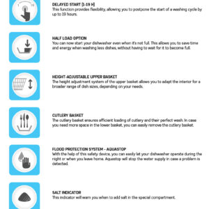 Poollaadungi valik, aquastop lekkekaitse ja programmide lõpu helisignaal lisavad mugavust ja turvalisust. Ülemine korv on reguleeritava kõrgusega (kui see on tühi), võimaldades pesta ka suuremaid nõusid alumises korvis.