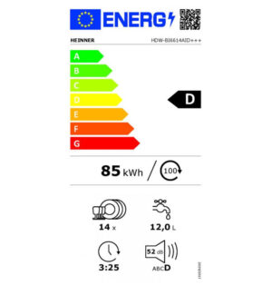 Heinner HDW-BI6614AID+++ on mahukas, täislai integreeritav nõudepesumasin, mis mahutab kuni 14 nõudekomplekti – ideaalne suuremale perele või neile, kes kokkavad tihti. Seade kuulub kõrgemasse energiasäästlikkuse kategooriasse (D), aidates hoida kulud kontrolli all.