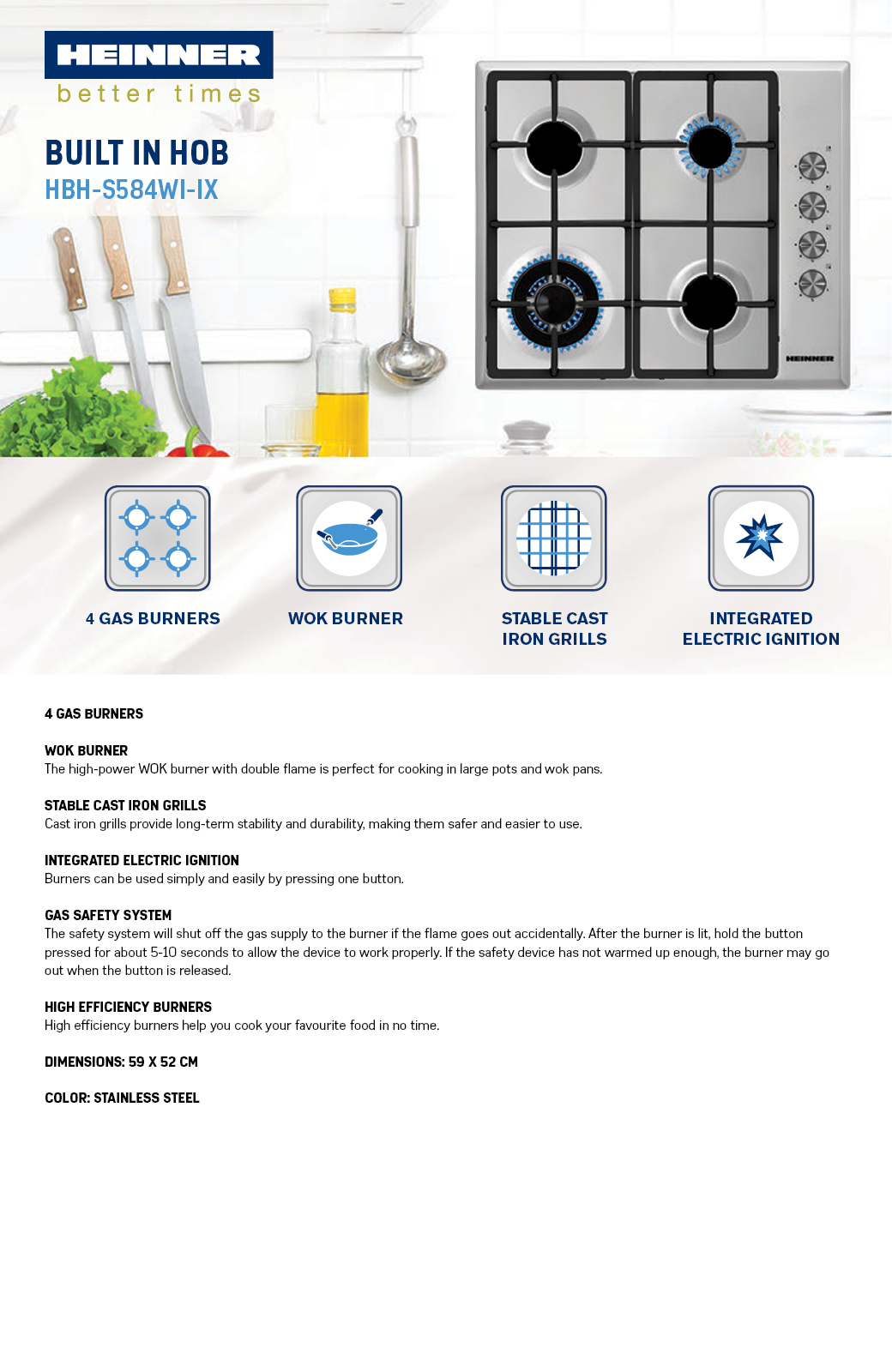Integreeritav gaasipliidiplaat Heinner HBH-S584WI-IX, 4 keeduala