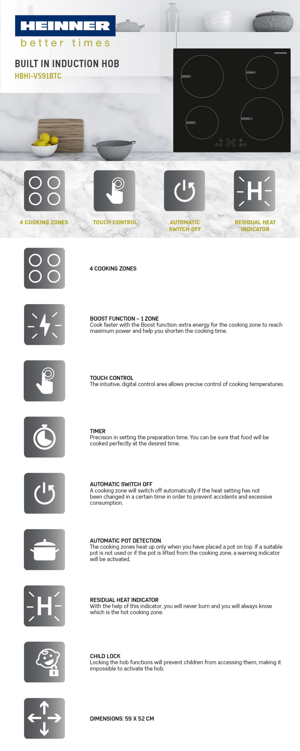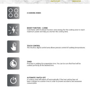 Induktsioonpliidiplaat Heinner HBHI-V591BTC pakub kaasaegset, kiiret ja energiatõhusat toiduvalmistamist. Seadmel on 4 induktsioonkeeduala, mis reageerivad koheselt temperatuurimuutustele ning tagavad ühtlase kuumuse. Ühel alal on saadaval ka Boost-funktsioon, mis kiirendab toiduvalmistamist andes hetkeks lisavõimsust.