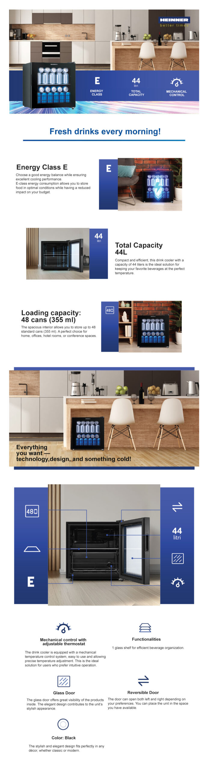 Heinner HBC-M44BKE on kompaktne 44-liitrine külmik jookidele, mis sobib suurepäraselt kööki, kabinetti, suvilasse või kodubaari. Kuna tegu on väikese vitriinkülmikuga läbipaistva uksega, on joogid alati nähtavad ja kergesti kättesaadavad.