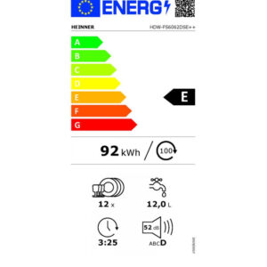 Nõudepesumasin Heinner HDW-FS6062DSE++ on täislaiuses (≈60 cm) seade mahutavusega 12 nõudekomplekti – sobib suuremale perele või kööki, kus pestakse regulaarsemalt suuremas koguses nõusid. Energiaklass E ja keskmine veekulu ~12 l tsükli kohta aitavad hoida toimimiskulusid kontrolli all.