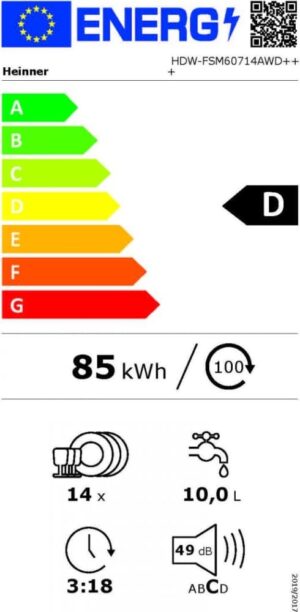 Heinner HDW-FSM60714AWD+++ on ruumikas ja funktsiooniderohke vabaltseisev nõudepesumasin, mis sobib hästi perele või aktiivsesse kööki. 14 nõudekomplekti mahutavus ja 3 korvisüsteem (sh ülemine söögiriistade sahtel) võimaldavad paindlikku ja tõhusat nõudepaigutust.