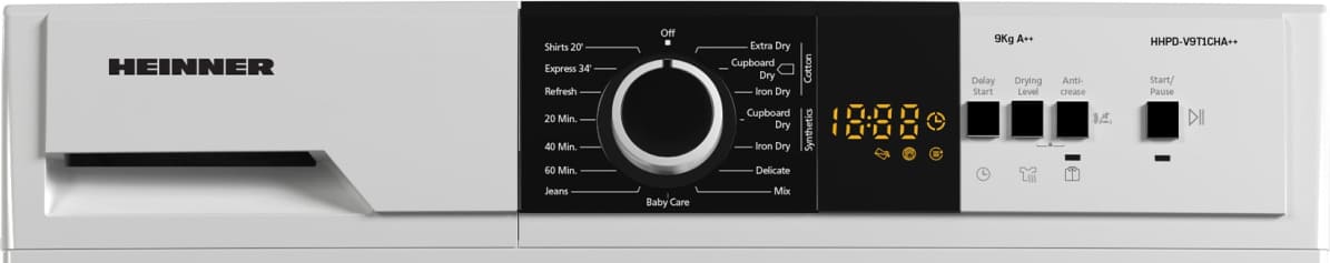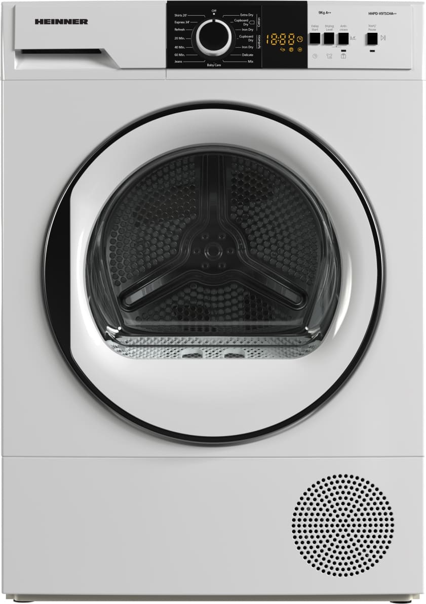 Kuivati (soojuspump) Heinner HHPD-V9T1CHA++ on tõhus ja kaasaegne kuivatuslahendus 9 kg mahutavusega, mis sobib suuremale perele või koduolukordadesse, kus kuivatusvajadus on regulaarne. Energiaklass A++ ning soojuspumbatehnoloogia tagavad madala energiatarbimise ja riiete õrna kuivamise.