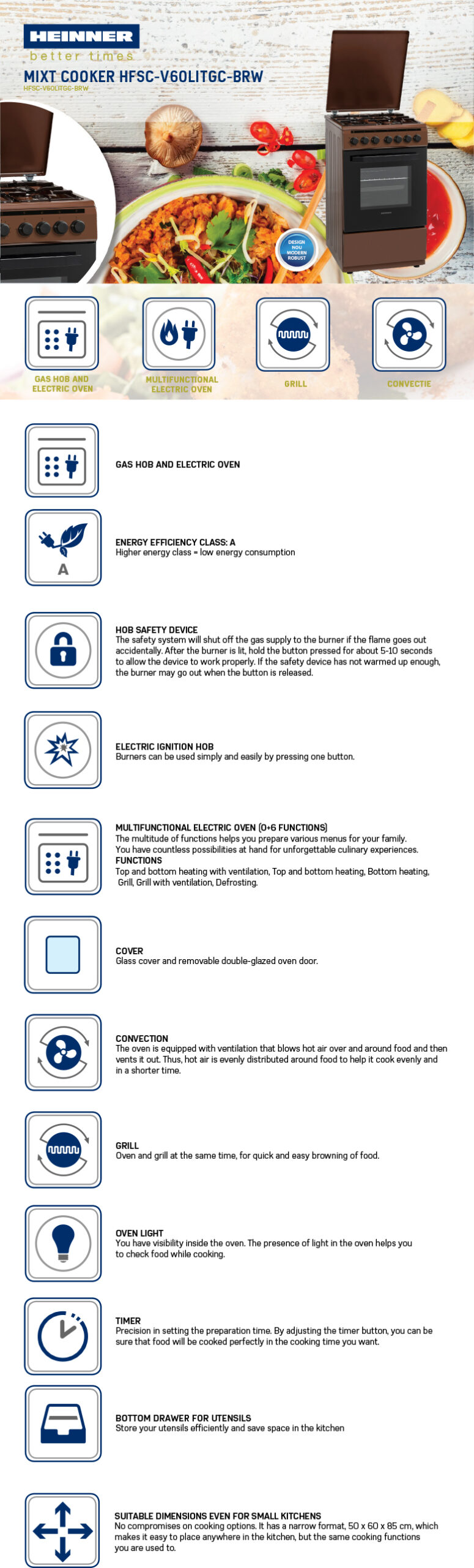 Gaasipliit (kombineeritud pliit) Heinner HFSC-V60LITGC-BRW – 4 gaasipõletit ja elektriahi. See ühendab endas gaasiplaadi mugavuse ja elektriahju täpse küpsetustulemuse. 60 × 60 cm mõõdus pliidil on 4 gaasipõletit, mis süttivad elektrisüüte abil ning võimaldavad kiiret ja täpset kuumuse reguleerimist.