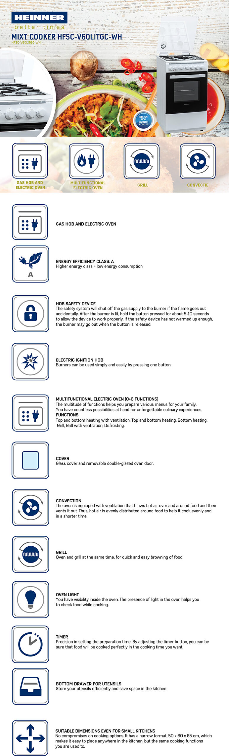 Gaasipliit (kombineeritud pliit) Heinner HFSC-V60LITGC-WH – 4 gaasipõletit ja elektriahi. See ühendab endas gaasiplaadi mugavuse ja elektriahju täpse küpsetustulemuse. 60 × 60 cm mõõdus pliidil on 4 gaasipõletit, mis süttivad elektrisüüte abil ning võimaldavad kiiret ja täpset kuumuse reguleerimist.Pliidi elektriahi on varustatud grill- ja pöördõhufunktsiooniga, mis tagavad ühtlase küpsetusprotsessi.
