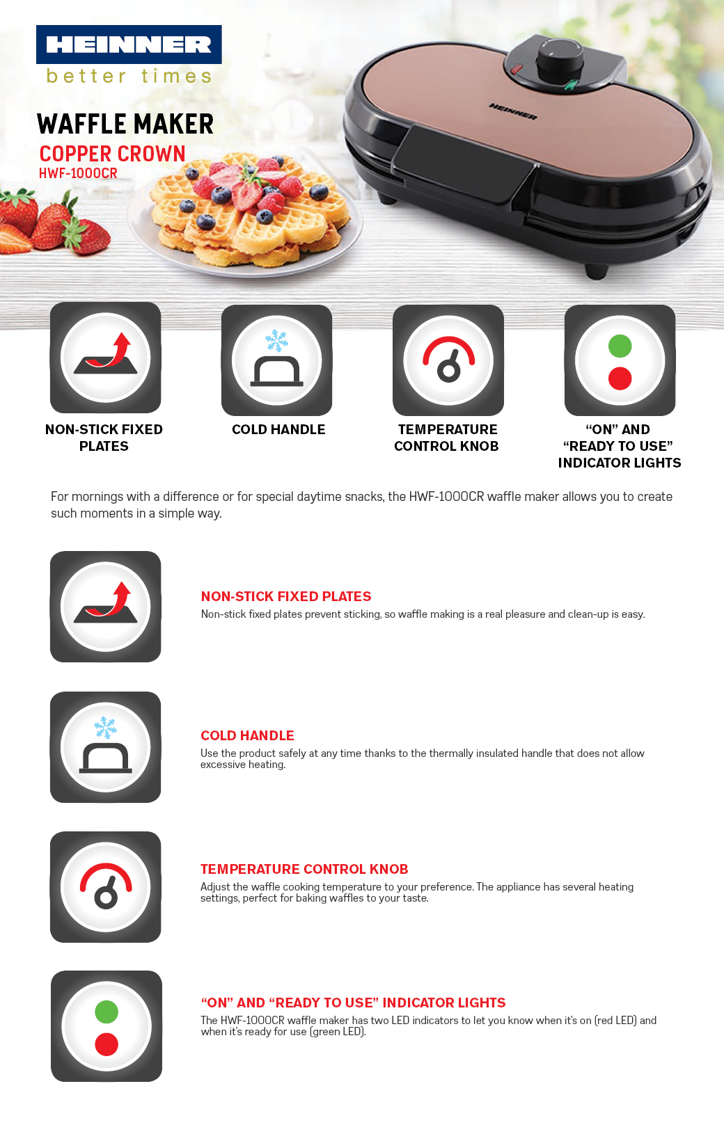 Vahvliküpsetaja Heinner HWF-1000CR on stiilne ja tõhus vahvlimasin, mis võimaldab kiirelt valmistada maitsvaid ja ühtlaselt küpseid klassikalisi vahvleid. 1000 W võimsus tagab kiire kuumenemise ja stabiilse temperatuurijaotuse, mistõttu saad valmistada krõbedaid või pehmeid vahvleid täpselt oma maitse järgi.