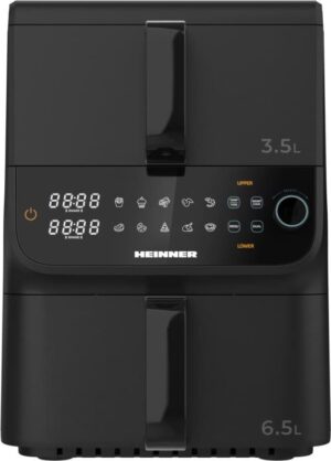 Heinner InnovaCook HAF-C10DBS25BK kuumaõhufritüür on võimas ja mitmekülgne kahekorviline air fryer, mis võimaldab valmistada korraga erinevaid roogasid. Kogumaht 10 liitrit (3,5 l + 6,5 l) ja koguvõimsus 2500 W (1000 + 1500 W) sobivad ideaalselt perele või suuremateks toidukordadeks.