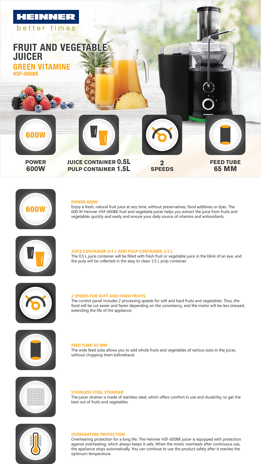 Mahlapress Heinner HSF-600BK on tõhus ja töökindel tsentrifugaalmahlapress, mis sobib suurepäraselt igapäevaseks värske mahla valmistamiseks. Tugev 600 W mootor purustab puu- ja köögivilju kiiresti ja ühtlaselt, aidates säilitada mahlade loomuliku maitse ja toitained.