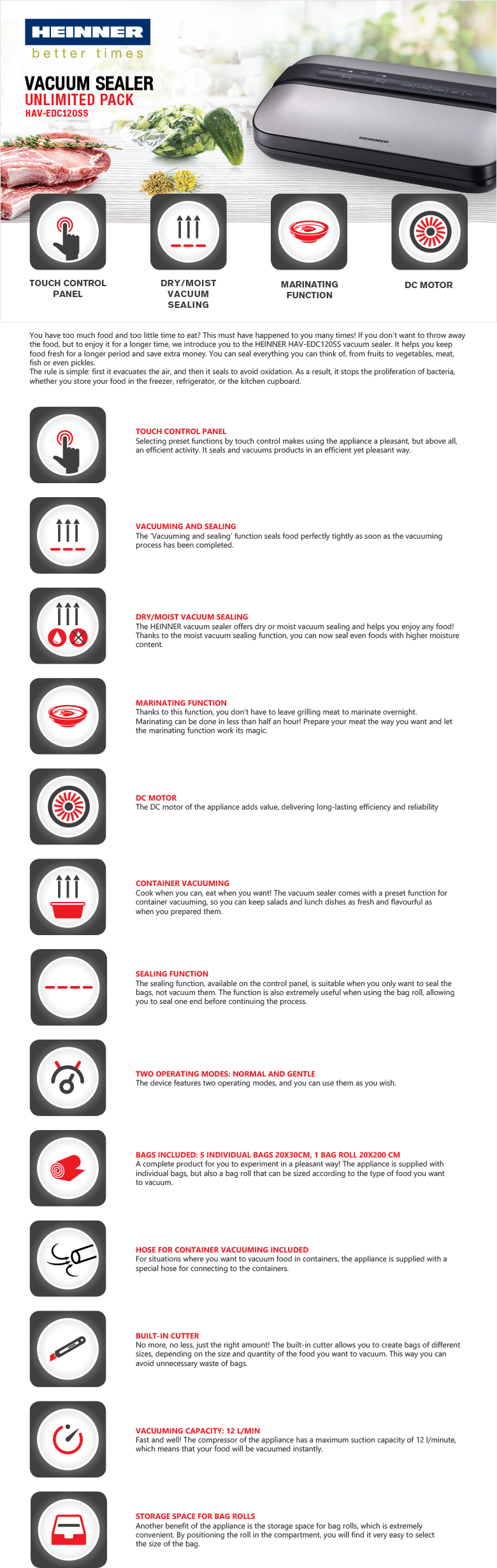Vaakumpakendaja Heinner HAV-EDC120SS on ideaalne abiline neile, kes soovivad vähendada toiduraiskamist, valmistada toitu ette sous-vide küpsetamiseks või säilitada toitu hügieeniliselt ja energiasäästlikult.