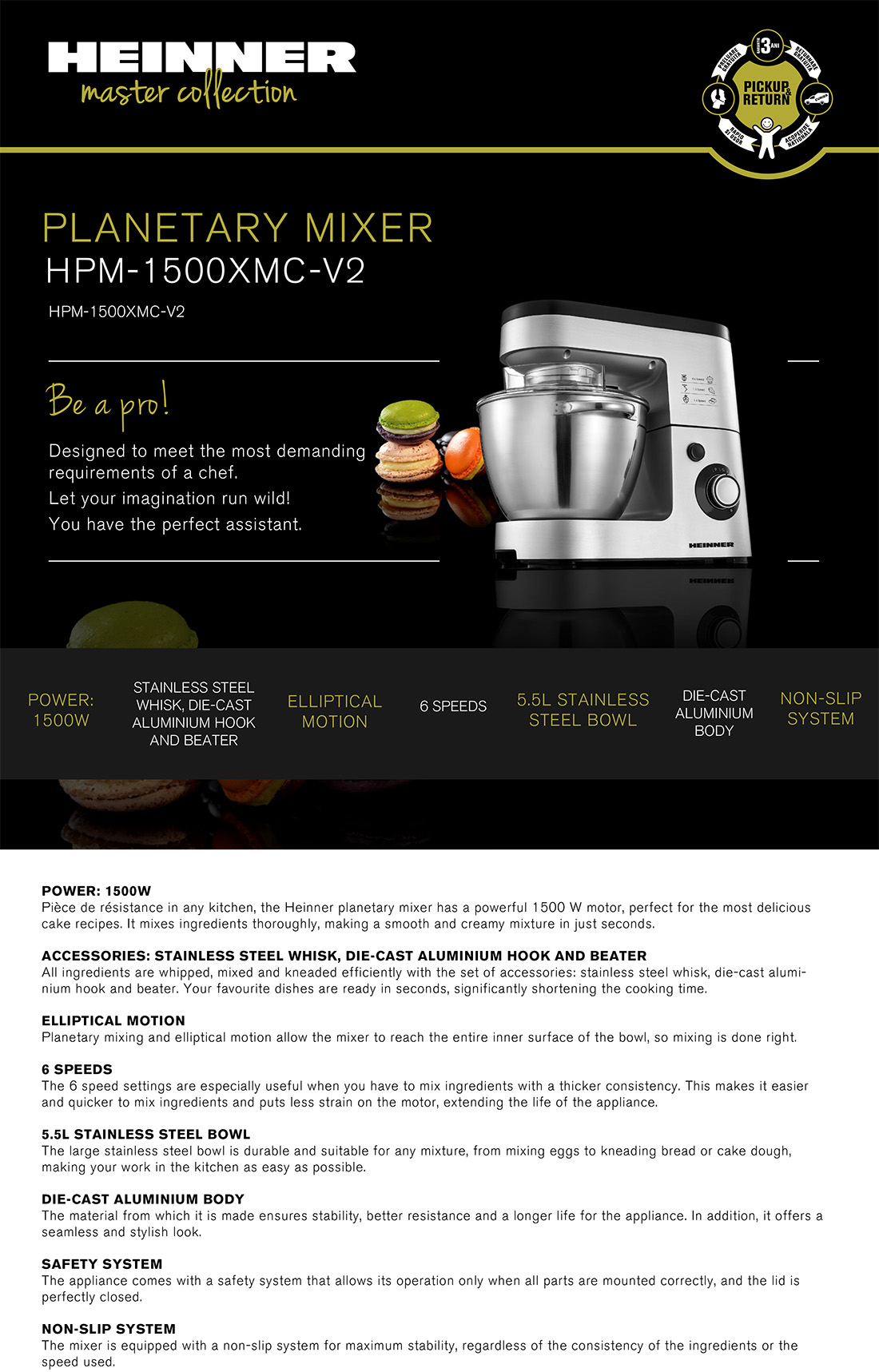 Lauamikser Heinner HPM-1500XMC-V2 pakub võimsat 1500 W mootorit ning 5,5-liitrist roostevabast terasest kaussi, mis sobib suures koguseks segamiseks, vahustamiseks või taignate valmistamiseks. Segamissüsteem tagab, et vispel liigub kausi serva suunas, saavutades ühtlase segamise kõikides nurkades.